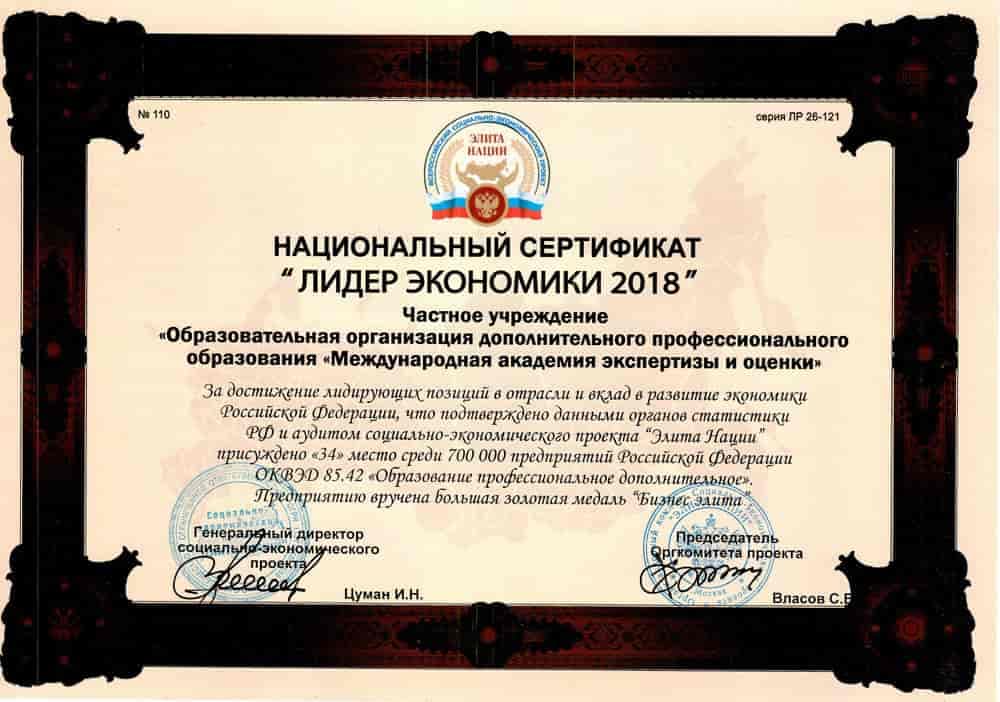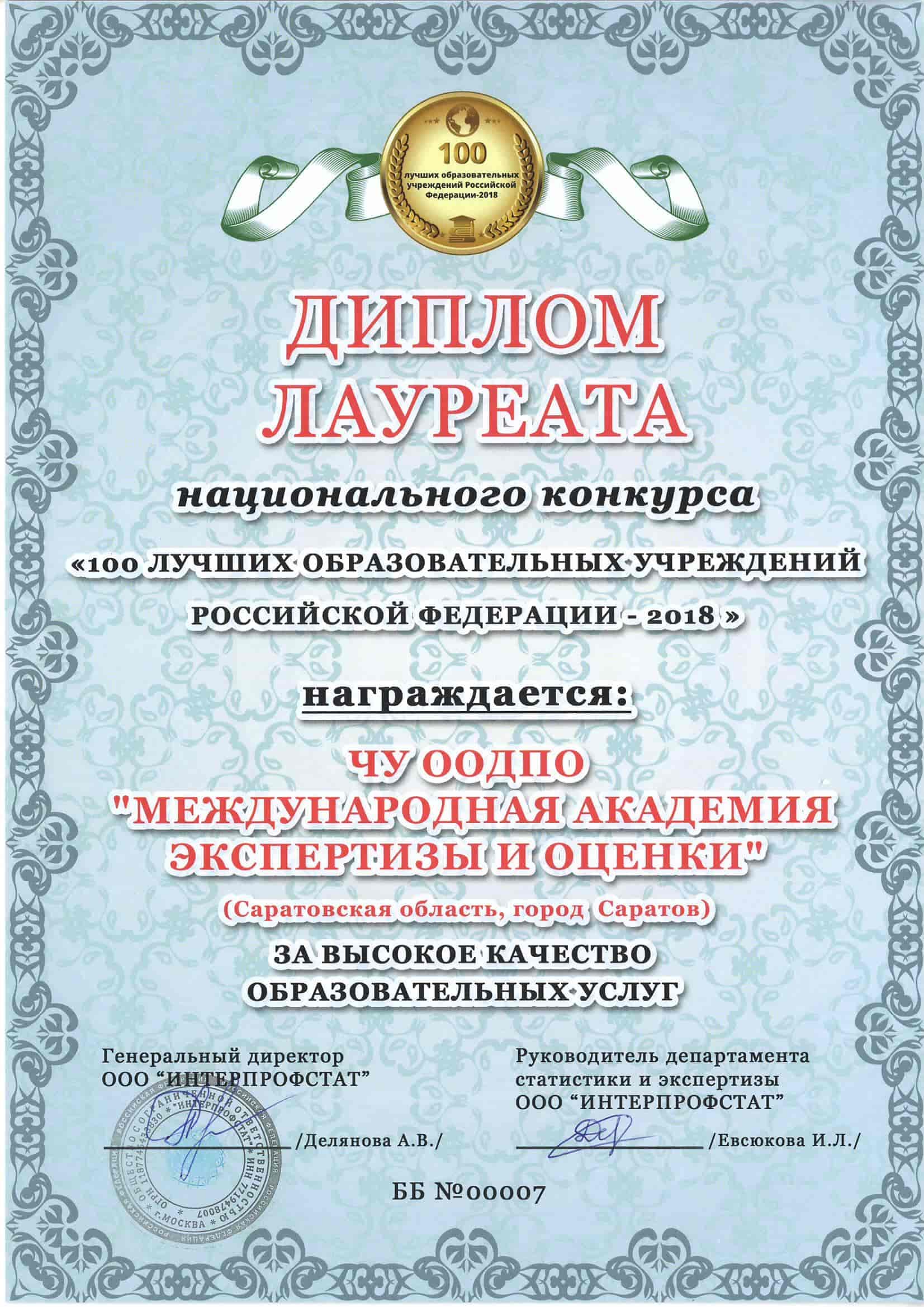 - ТОП-100 лучших образовательных учреждений России по данным Интерпрофстата в 2018 г.;